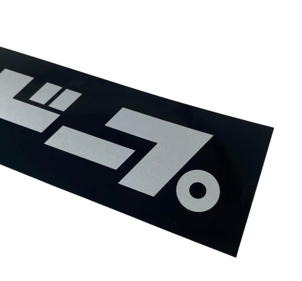 銀と黒のプリントに、グロスコーティングの耐候性ステッカー。